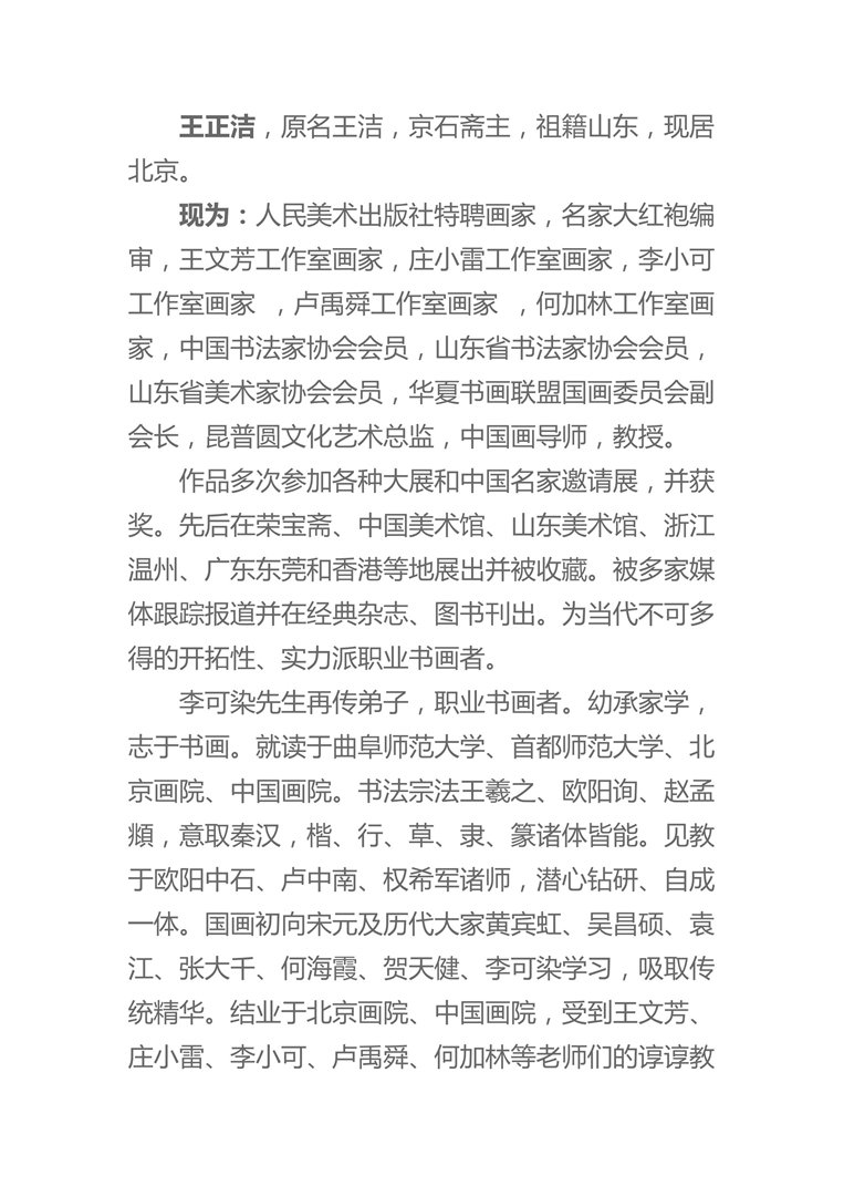 王正洁,祖籍山东,现居北京。现为:人民美术出版社特聘画家,名家大红袍编审,王文芳工作室画家,庄小雷工作室画家,李小可工作室画家 ,卢禹舜工作室画家 ,何加林工作室画家,中国书法家协会会员,山东省书法家协会会员,山东省美术家协会会员,华夏书画联盟国画委员会副会长,昆普圆文化艺术总监。